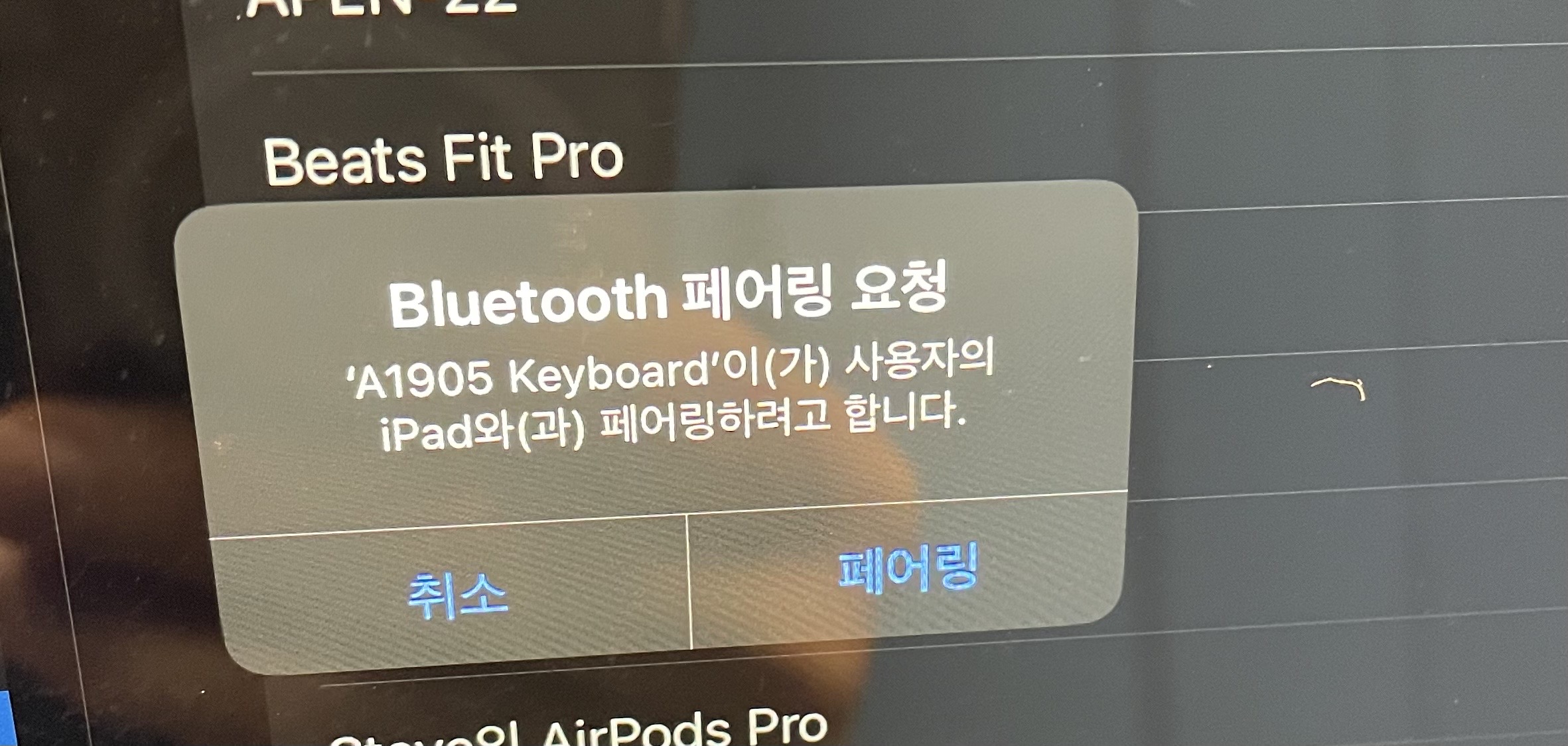 제품을 위 스웨이드 재질이 있는 포고핀자리에 맞추어서 착 붙이고 요 화면에서 페어링 하시면 끝!