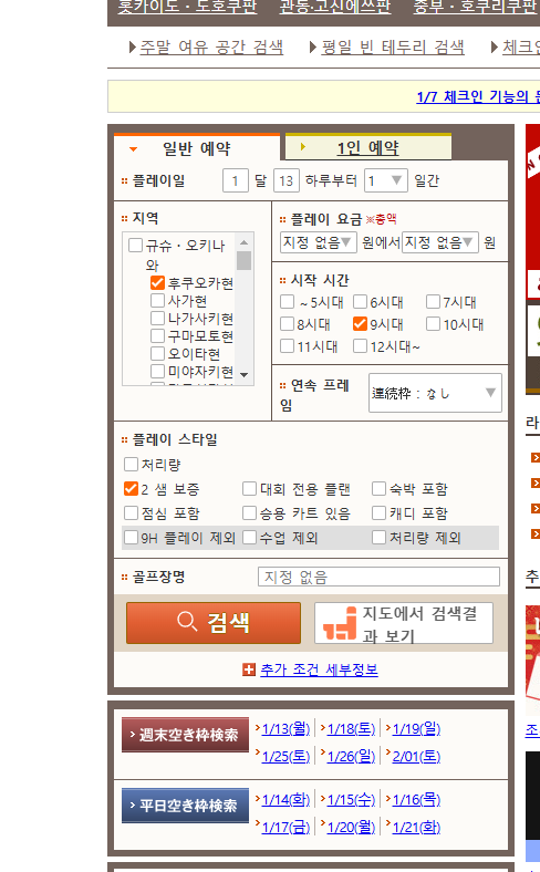 왼쪽 화면이 가고 싶은 도시와 시간대, 4인 플레이 할것인지, 2인 플레이 할것인지, 점심을 포함할것인지 등등 조건을 결정하고 검색을 클릭하면 됩니다. 참고로 일본은 거의 노캐디로 진행이 되며 비만 오지 않으면 페어웨이는 진입 가능 하더라구요. 그리고 2인플레이는 약 한화로 1~2만원 추가금이 발생 합니다.
