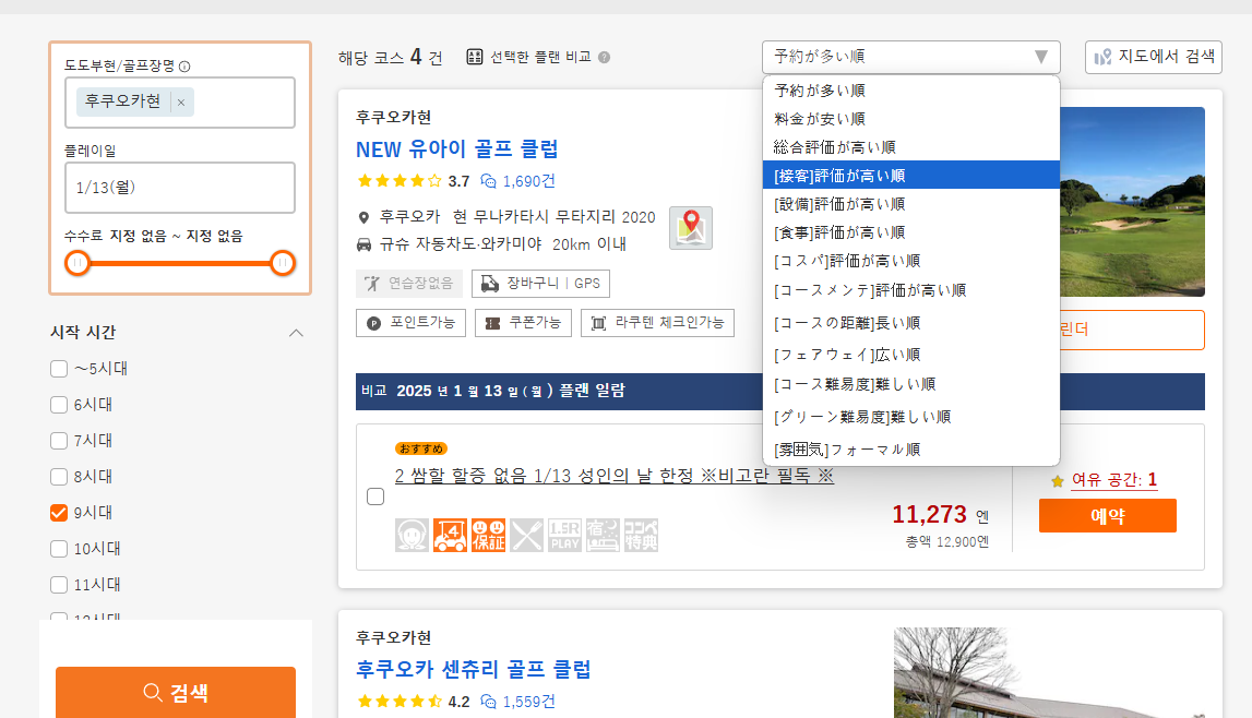검색을 클릭하면 이렇게 구장이 나오게 됩니다. 머 예약 이 많은곳, 평점이 좋은곳, 식사 무료제공등 조건을 미리 결정하시거나 아니면 다양한 순서로 구장 상태를 보시면 좋습니다. 저는 평점과 숙소에서의 거리를 보고, 그래도 바닷가 근처에서 색 다른 경험을 하고 싶어서 오션뷰가 가능한 골프장을 찾아 보았습니다.