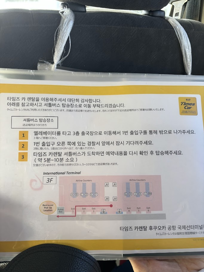 후쿠오카 가시는 분들은 공항에서 나오면 로비 1층인데 타임즈 렌트카 카운터로 찾아가면 3층 경찰서 옆으로 가라고 안내해 줄겁니다. 거기가 렌트카 대여 장소로 이동하는 셔틀버스가 오는곳 이거든요