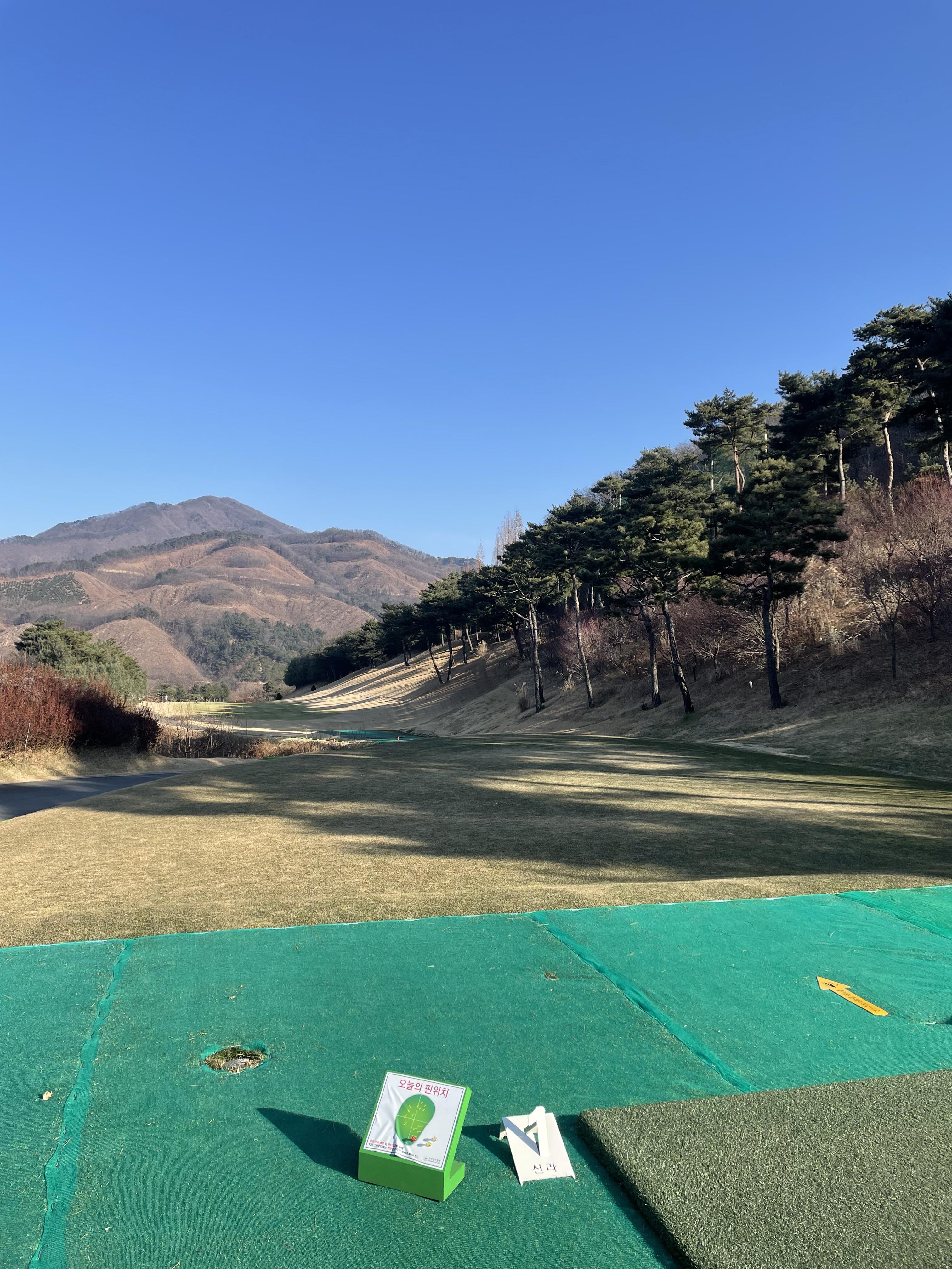 대부분 그러시겠지만 매트에서 티샷 하는 걸 선호하지 않죠. 하지만 우리나라 대부분 구장에서는 티샷을 저런 매트를 깔아 놓고 사용하게 합니다. 관리의 어려움 때문 이겠지만 개선되었으면 합니다. 겨울이라 이제 매트에서도 티를 꼽기가 쉽지 않습니다.